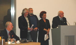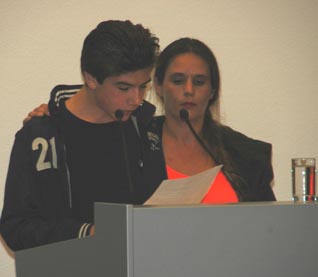 | Emotionele en diep traumatisch getinte verslagen van bewoners van de Deutersestraat nav de inval op 31 oktober 2014 in hun kampje in Deuteren. foto's © paul kriele, 17 april 2014. | -Links: Tom de Booij aan het spreekgestoelte en daarachter Popke en Antje Brummer- Offenberg, welke laatste ook voor de getraumatiseerde Gerrit Brummer sprak. -Hierboven: de jongste, de 13-jarige bewoner Hannes Brummer en diens moeder Sjenieke Resmann. |