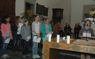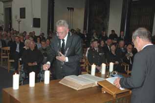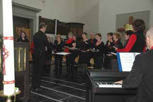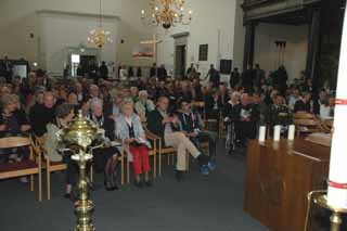 | -De grote kerkzaal van de voormalige Hervormde kerk op het Kerkplein, waar de herdenkingsplechtigheid plaats vond. -Rechts: Het Mi Canto koor olv Enrico van Schaik. |
