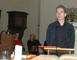 | -Rechts: JanJulius Wintermans die als vertegenwoordiger van het COC een gedicht van Jan van Velthoven 'Vrijheid verplicht' voorlas en ook een kaars opstak. *Voor tekst gedicht zie hieronder. |
