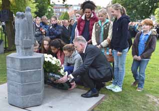 | Scholieren van de basisschool Het Bossche Broek en van het St Janslyceum, die het Joods scholierenmonument hebben geadoprteerd, legden er zondagavond 4 mei 2014 met loco-burgemeester Geert Snijders een krans bij. foto © henk van esch, 4 mei 2014. |