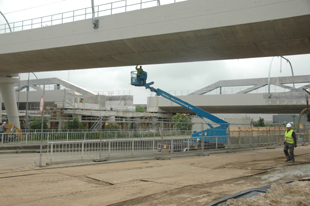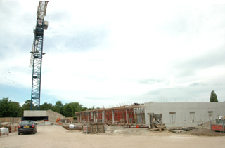 -Boven: Gymzaal met leslokalen achter het St. Janslyceum in aanbouw. -Rechts: Spoorbruggen in aanbouw over de Dieze. Op de voorgrond is momenteel ook nog een brug voor de verlengde Parallelweg in aan constructie. foto © paul kriele, 20 mei 2014. |