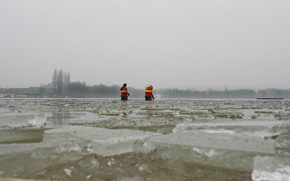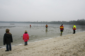 Die manifestatie werd begeleid door de jubilerende Bossche Reddingsbrigade die eerst eeen gat in het ijs moest slaan.