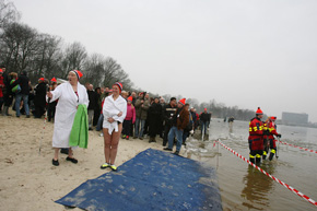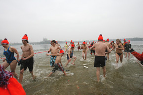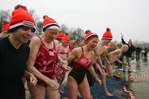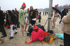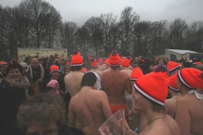 Hierboven: Unoxmutsen en badjassen hielden wat vrieskoude tegen. Het was voor sommigen een plons en voor anderen een kwikduik.