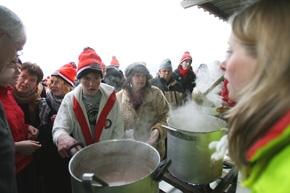 En hieronder: na die historische duik snel terug naar de warmtestralers om te drogen en daarna een kop soep eten.