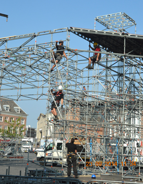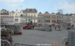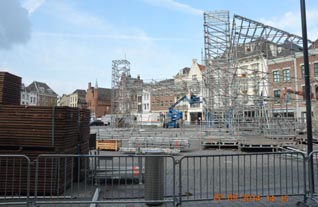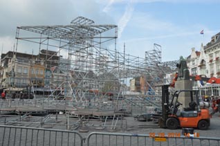 ![]() | -Boven en links de opbouw op de Markt van 'de Kathedraal' voor het jubileumfeest van de Oeteldonksche Club anno1882. foto's © paul kriele, 22 september 2014. |