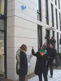 Links: de tientallen bewoners die op de ceremonie waren afgekomen. In de wigman klonk muziek van de Muzieksleutel F, die door geluidskunstenaar Dyane Donck was gecomponeerd. Voor directeur Henk Roozendaal betekende de opkomst dat de velen die waren teruggekeerd naar de wijk, er zich thuis voelden. Rechts boven: Bertie van den Heuvel [m]van De Kikvorschen en directeur Henk Roozendaal [r] en kunstenares Simone van Brakel [l] onthulden de keramieken sleutel aan de flat in de Van Hobestraat. foto's © paul kriele,11 januari 2009. |