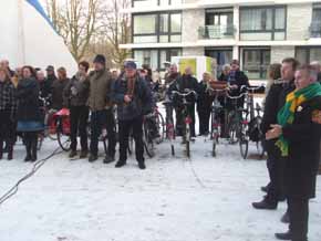 De ceremonie vond plaats temidden van de nieuwbouw in de Van Hobestraat, vlakbij de IJzeren Vrouw waarop honderden die middag aan het schaatsen waren.