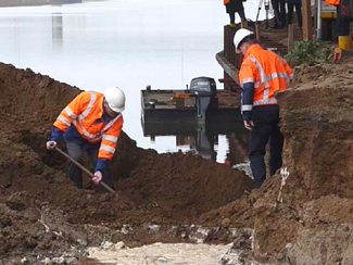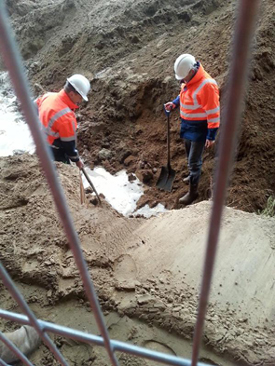 | Technisch manager Evert Aukema van Rijkswaterstaat en Jaap Blokland van WillemsUnie graven het laatste zand weg. | foto's © video Brabants Dagblad [l.] en Willems Unie, 20 november 2014. |