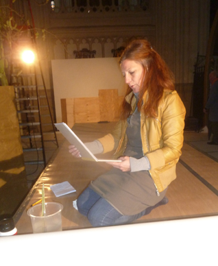 Kunstenaar Nelleke de Noo die het draaiboek doorneemt waarin het thema - de geboorte van Christus in een wereld die geen kwaad kent -van dit jaar staat beschreven. foto © paul kriele, 2 december 2014. |
