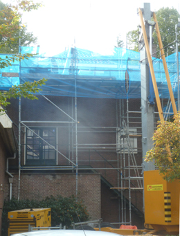 Herman Moerkerkplein De huisvesing van Rederijkerskamer Moyses Bosch op moment van een noodgedwongen dakreparatie in 2013. |