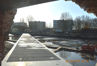 -Boven: Het gat in de stadsmuur waardoor voetgangers straks [ vanaf juni 2015] vanuit de parkeergarage naar de Casinotuin kunnen lopen. Op de achtergrond de flats aan de Gregoriussingel. -Rechts: De verkeersbrug in de Hekellaan die over het voetgangerspad ligt. foto's © paul kriele, 4 maart 2015. |