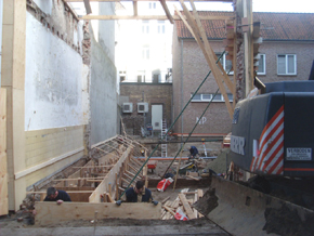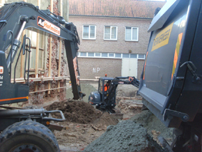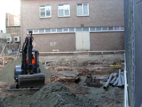 | Boven: het linker gedeelte van het perceel, waarop voorheen de schoenwerkplaats van de Bata [links] stond. De rechter, ofwel de zuidelijke muur daarvan uit de 15e [mogelijk 14e eeuw] blijft bewaard. Een houten beschoeiing wordt aangelegd rondom die stenen resten van in dit geval de refter. foto's © paul kriele, 20 januari 2009. |