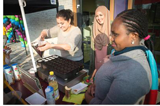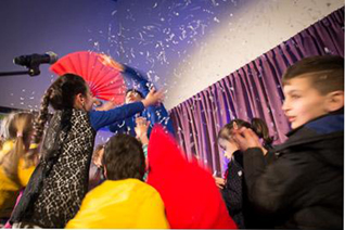 | -Boven: Poffertjes bakken in de Wereld keuken. -Rechts boven: De rondleiders Sumaj, Kyria en Mujoe. -Rechts: Optreden van de Bossche illusionist Aires. foto's © bart oosterveld, 13 maart 2015. |