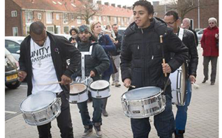 -Links boven: Wethouder Eric Logister in gesprek met de BBS manager Fatima-Zahra Jallal. -Links Schoolkindje geeft aan wethouder Eric Logister de schaar om het lint door te kunnen knippen. -Boven: Unity Brassband. foto's © bart oosterveld, 13 maart 2015 |