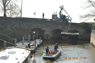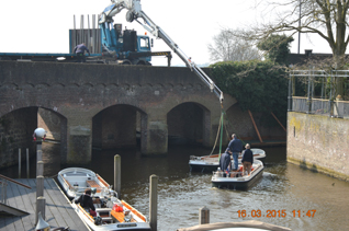 Het te water laten van zeven rondvaartboten van 'de Kring' vanaf een oplegger van Lammers uit Nieuwkuijk naar de aanlegsteiger bij de Oude Dieze. foto © paul kriele, 16 maart 2015. |