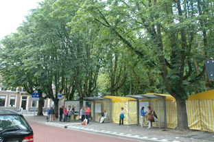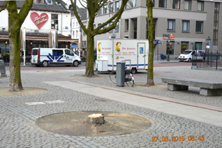 De gekapte kastanjes op de Parade: aan de zijde cafee's, de zijde bushalte, bij de voormalige Weesstraat en aan de zijde pastorie St.Jan.