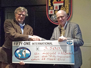 Leergeld bestrijdt de gevolgen van armoede onder Bossche kinderen. Voorzitter Hans van Veen van Leergeld nam de cheque van voorzitter Leo Sedee van Fifty-One in ontvangst.