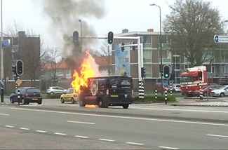 Kruispunt bij provinciehuis Bestelbus van Coffee3 in brand. foto © jan de bie, 8 april 2015. |