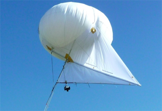 De helikite hangt op zaterdag 18 april 2015 boven het Burg. Loeffplein. Mbv 4G of Wi-Fi staat het - via internet - in kontakt met de grond. |