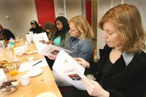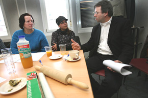 | Boven: Belangstelling van culinaire deskundigen.....en het proeven van de gerechten met rechts Henk van Roozendaal, directeur Brabant Wonen. Rechts: .. en ook als eerste op zoek gaan naar het eigen recept.... foto's © marc venrooij, 27 januari 2009. |