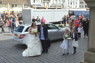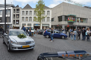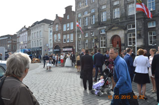 De drukte voor het stadhuisbordes viel mee een toppunt was rond 14.00-14.15 uur te zien. Een extra ingezette bode leidde de elkaar tegenkomende bruidsparen en hun families in goede banen.