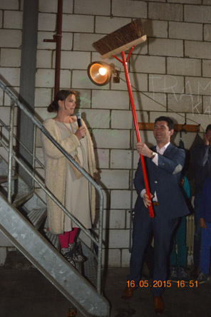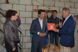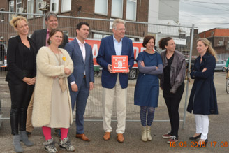 | -Rechts: Petra Janssen van de Pleisterplaats gaf wethouder Eric Logister als dank een cadeau uit om het samen werken nog eens te benadrukken. De bezem draagt een social label. Het was gemaakt in een sociaal atelier in Deventer. 'Het staat symbool voor de handen uit de mouwen steken,' zei Petra Janssen. Wethouder Logister haakte daarop in door te stellen dat ook hier [werkwarenhuis inde machinekamer] gewerkt wordt met mensen met een afstand tot de arbeidsmarkt’. -Rechts boven: Querine Winkler vertelde over het feit dat Pakhuis De Zwijger als eerste in Den Bosch start. Het project heeft zich al over 31 steden in ’t land uitgebreid. Nieuw Nederland Stichting de Tramkade heeft zich bij Nieuw Nederland, een landelijke organisatie van steden intransitie, aagesloten. Daarmee is de Tramkade Ambassadeur van Nieuw Nederland in Den Bosch geworden met een bijpassende plaquette, die nog zal worden opgehangen. -Van de Conceptbouwers kreeg wethouder Logister het boek 'Oranje Economie' cadeau. foto's © paul kriele, 16 mei 2015. |
