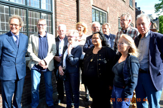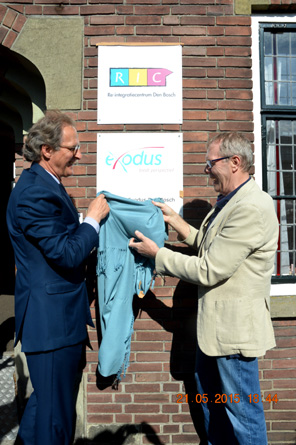 Dat is gelukt dankzij de inspanning van velen van de hier aanwezigen'. Daarbij verwees Rombouts naar het groot aantal vrijwilligers dat aanwezig was. Met een tiental [specifiek Gerrit Timmersma] van hen onthulde de burgemeester het bord van Exodus en RIC aan de voordeur van het pand Sonniusstraat 3.