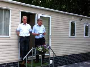 Het nieuwe chalet The Hawk van de Vincentiusvereniging op het vakantiepark in Vinkel. Jan Bakker, lid caravancommissie, onthult de naam: The Hawk. |
