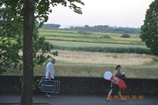 Terwijl de eerste operaliefhebbers met stoelen en al huiswaarts keren is ver op de achtergrond de rook van de brandende hooibalen zichtbaar. foto © paul kriele, 30 juni 2015 / 21.45 uur. |