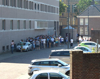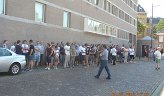 | foto's © paul kriele, 1 juli 2015. | Het personeel staat in de schaduw buiten te wachten. Ze dachten dat het een oefenalarm was en ze getrakteerd zouden worden op een ijsco, zoals wel eerder was gebeurd.... |