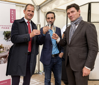 Een proost op de start van de nieuwbouw, vlnr Clemie van Wanrooij, Mohamed Acharki en wethouder Eric Logister. foto © marc bolsius, 22 september 2015. |