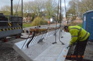 | St Janssingel Het takelen van de elementen voor de Mariabrug. De liggers, die nog in Duitsland waren achtergebleven, zijn dinsdag 17 november 2015 aangevoerd en gelegd. foto's © paul kriele, 18 november 2015. | ![]() |