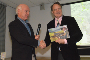 Aan het slot van de bijeenkomst in Perron 3 van De Groene Vesting reikte voorzitter Gerard Berkelmans [l.] aan wethouder Huib van Olden van o.a. Vestingwerken het eerste exemplaar van het Beeldverhaal 'Landschap van de Verwijzing' uit. foto © paul kriele, 23 november 2015. |