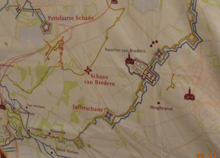 | Wim van Agt nam de zaal in zijn lezing mee naar een van de negen forten rond Den Bosch: fort De Brederode. [Op de kaart in de rechter helft, zie pijltjes]. |