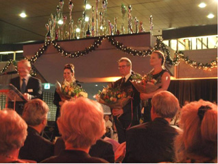 -Links: De solisten: vlnr. Louis Vossenberg van de volkskerstzang 's-Hertogenbosch , NN, Jeroen Felix van de Schola Cantorum en Anneke Konings-Kros dirigent van de Orthense Harmonie. |