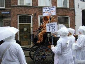 | Het motto van de Groep 'Zone van ons moeder' was ' Boerelééénbank van Rampspoed', daarmee inhakend op de financiële crisis. Zij beelden een Boerenleenbank uit die opgetrokken is in de stijl van F.van Lanschot bankiers... | De Swervers nodigen uit: Dè gaot- net zoals het bisdom-naor Rome toe. Inschrijvingen via een uitgedeeld biljet... |