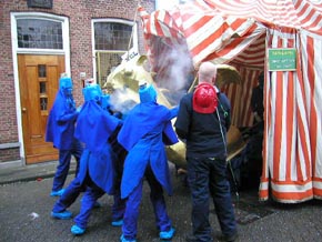 | De Jutters, die Unne Jutter en een rokende Draok uit zijn tent lokken. Ontwerp Sara Verboven. foto © paul kriele, 23 februari 2009. | foto © willy kersten, 23 februari 2009 |