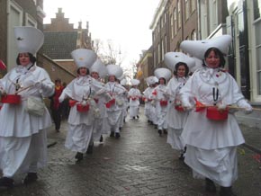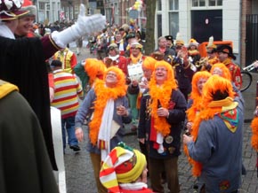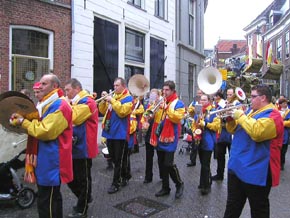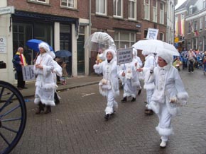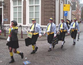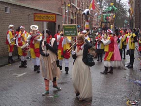 Rechts boven en links onder: de Dissidentjes een club van circa 15 man die de gewoonte heeft elk jaar op maandag de optocht in tegengestelde richting te lopen. Dit keer kregen zij gezelschap van de Bredase band 'Zoetwatermakrelen.' Op de hoek Peperstraat/Oude Dieze begroeten zij de prins en diens Gevollug.