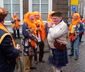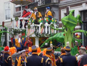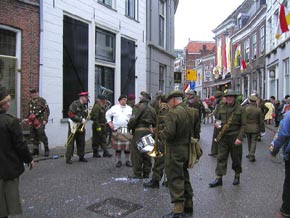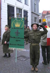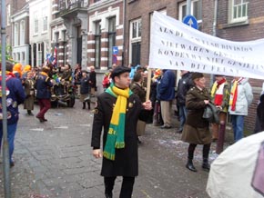 ![]() | Hierboven: vlak voor de Prinsenwagen lopen de Kikvorschen en hun hoffanfare, allen gekleed in een militair uniform van de oorlogsjaren. Zij brengen een eerbetoon aan de 53rd Welshdivison die de stad op 27 oktober 1944 bevrijdden. 'Als de Welsdivision niet was geweest, konden we niet genieten van dit feest,' staat op het witte spandoek [foto links boven]. foto's © willy kersten [r-boven] en paul kriele, 23 februari 2009. |