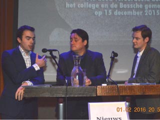 -Links boven: Mike van der Geld [fractieleider D66, Koen van de Krieken, docent Bestuurskunde en links Nol Roos van de BVP in debat in Nieuwscafé van maandag 2 februari 2016. foto's © paul kriele, 2 februari 2016. |