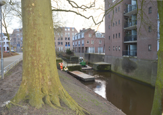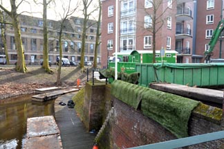 | Achterin de verlengde Pastoor de Kroonstraat en rechts de bebouwde locatie van de brandweer. Dat binnenterrein kreeg, na vertrek van de brandweer, de naam Water en Vuurplein. | De Geertruisluis waar door slib de diepte is verminderd en er ook van een lichte vervuiling sprak is. Op dit punt komt een keer mogelijkheid. foto's © paul kriele, 7 maart 2016. |