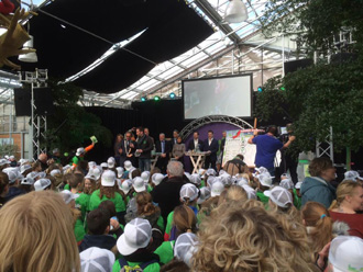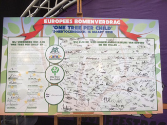 -Boven links: Intratuin: De ceremonie bij het debat rond boomfeestdag en links de ondertekening door de jeugd van het Europees Bomenverdrag : 'Eén boom per kind'. |
