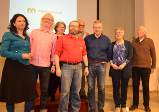 De buurtverbinders die het platform www.binnenbuurten.nl faciliteren. vlnr.: Helen van de Paverd, Vico van der Voort, Liesbeth van Drunen, Martien van Ee, Jan Verkade, Hans Kessens, Diny Albers en Toon van Rijnsoever. foto © paul kriele, 21 maart 2016. |