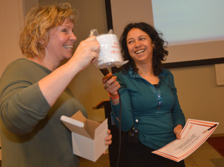 -Links: Hanneke van Stokkom van mijnbuurtje.nl oevrhandigt Helen van de Paverd een koffiemok waar de buurtverbinders met zijn allen [..] koffie uit kunnen drinken.. |