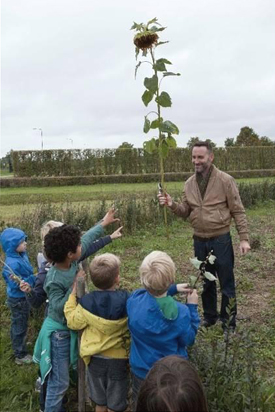 Kunstenaar Frank Bruggeman verkoopt een zadenzakje op de Geraniummarkt |