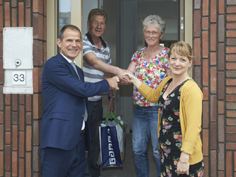 | De eerste bewoners van een duurzame woning in de Adelheidstraat in Orthen Links, worden gefeliciteerd door bouwdirecteur Clemie van Wanrooij en BrabantWonendirecteur Marije Buursink. |
