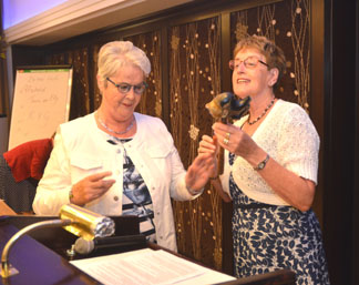 Oud-voozitter Toos Lukassen overhandigt aan haar opvolgster Frieda Bogaart de voorzittershamer. |