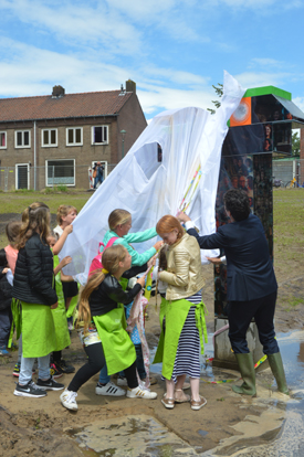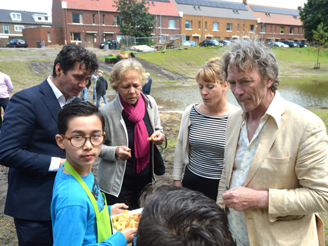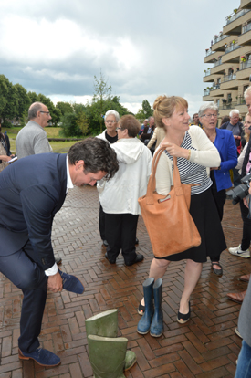 | foto's © paul kriele, 2 juli 2016. | Zaterdagmiddag 2 juli 2016/14.00 uur Na een flinke hoosbui, die precies op het onthullingsmoment begon maar slechts tien minuten duurde, kon het evenement 'Afscheid en welkom' aanvangen. Maar eerste moesten wethouder Eric Logister en Brabant Wonendirecteur Marije Buursink de laarzen aandoen.. |