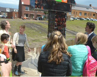 -Boven: Het kostte enige moeite om het doek van het monument te halen, maar met vereende krachten van de jeugd kwam 'De Mus' tevoorschijn. Op de zuil staan achter transparant glas tientallen foto's afgebeeld van Orthen-Linksbewoners/sters. 's Avonds is het monument verlicht -Links boven: Uiterst links de kunstenaar Kees van den Boogaart en Brabant Wonendirecteur Marije Buursink en in blauw pak wethoude Erik Logister. -Links: Sven van de Laarschot, de bedenker van 'De Mus'. foto's © paul kriele, 2 juli 2016. |