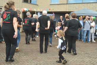 | -Boven: The Red Ladies van de line danceclub. -Rechts Voorblad van de losbladige maandkalender waarvan het 'eerste exemplaar' aan wethouder Logister en Marije Buursink [Brabant Wonen] werd uitgereikt. De kalender is gemaakt ter herinnering aan de mooie wijk. Concept: vormgever Raoul Wilke en Typische Producties. foto's © paul kriele, 2 juli 2016. |